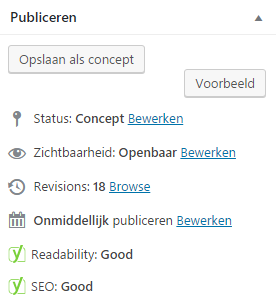 Het bovenstaande kun je op alle pagina’s toepassen voor een goede SEO. Rechts bovenin zie je dan of de pagina goed geoptimaliseerd is voor de zoekmachines, zoals op de onderstaande afbeelding.