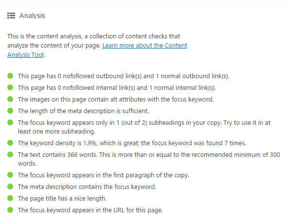 Een focus keyword is een relevante zoekterm voor jouw pagina. Dit kunnen ook meer woorden zijn of woordcombinaties. Voor dit artikel is de focus keyword ‘Yoast SEO’. Onder de focus keyword zie je een analyse van Yoast SEO staan. Gebruik deze analyse als een checklist voor de optimalisatie van jouw pagina. Zorg dat alle aspecten groen gemarkeerd zijn zoals op de onderstaande afbeelding.